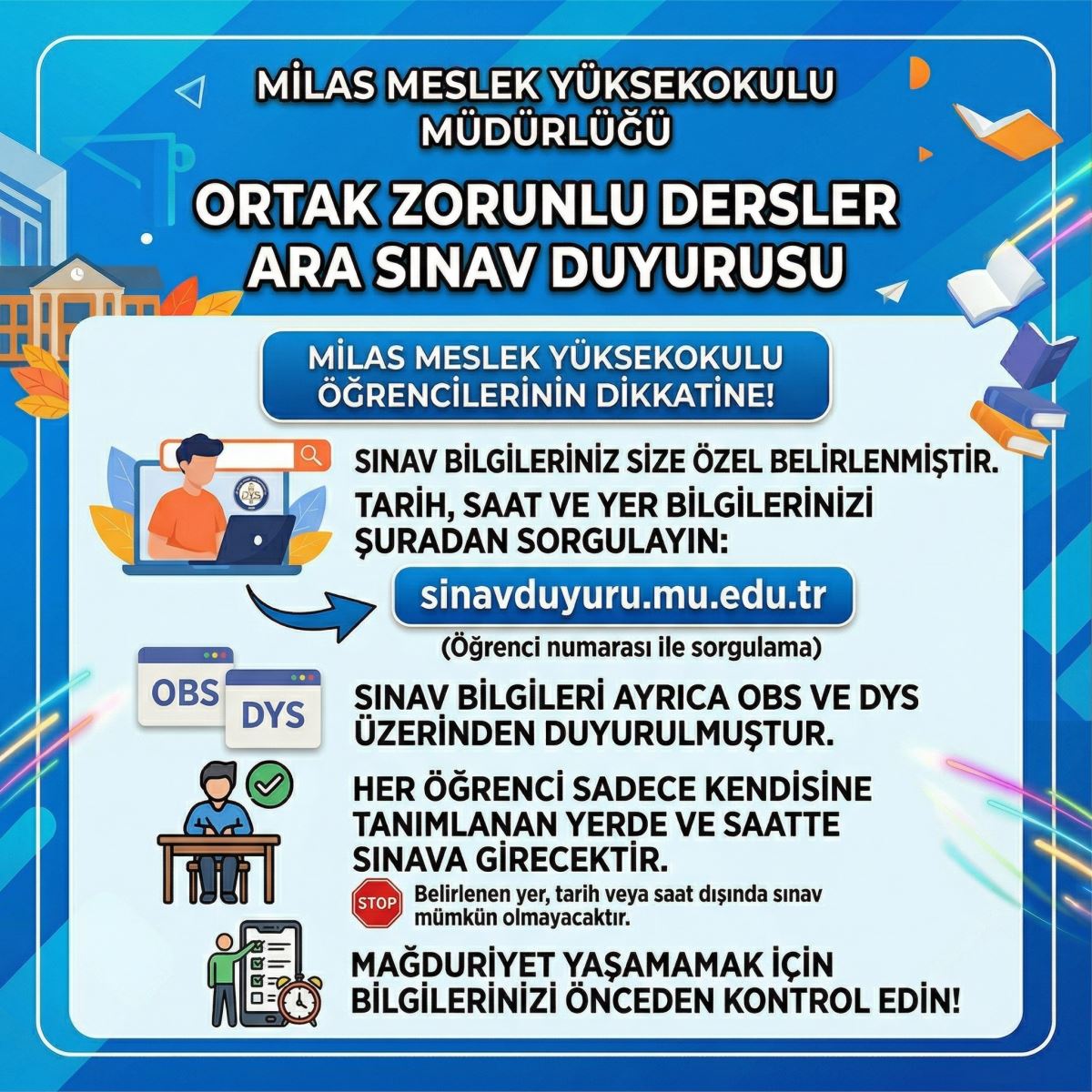 ORTAK ZORUNLU DERSLER SINAV TARİH VE SAATLERİ ORTAK ZORUNLU DERSLER İSİM LİSTESİ SINAV SAAT VE TARİHLERİNİ GÖRMEK İÇİN TIKLAYINIZ Son Güncelleme : 24.03.2026 16:51 Okunma Sayısı : 78